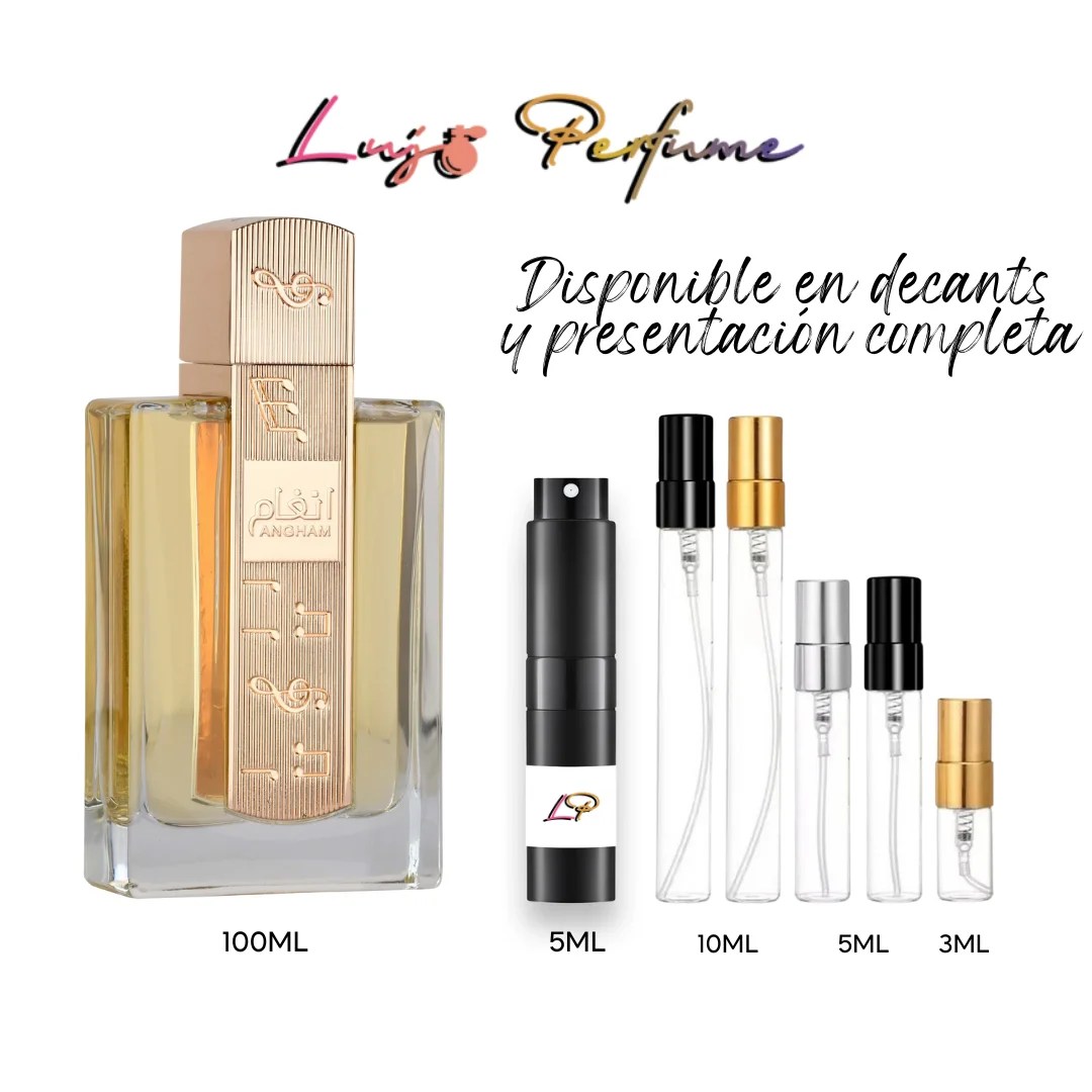 ¡Descubre el encanto de este cautivador perfume árabe en presentación completa o en nuestros decants de perfumes o probadores de 3ml, 5ml y 10ml, Angham de Lattafa en Lujo Perfume!